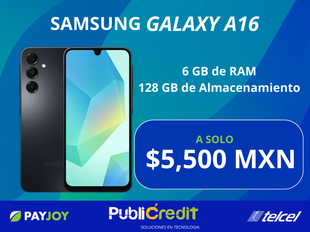El Samsung Galaxy A16 tiene pantalla Super AMOLED de 6.7″ FHD+ a 90 Hz, triple cámara de 50 MP, 4 GB de RAM y 128 GB de almacenamiento, además de batería de 5,000 mAh con carga rápida, resistencia IP54 y hasta 6 años de actualizaciones, ideal si quieres un teléfono fluido y que te dure varios años.