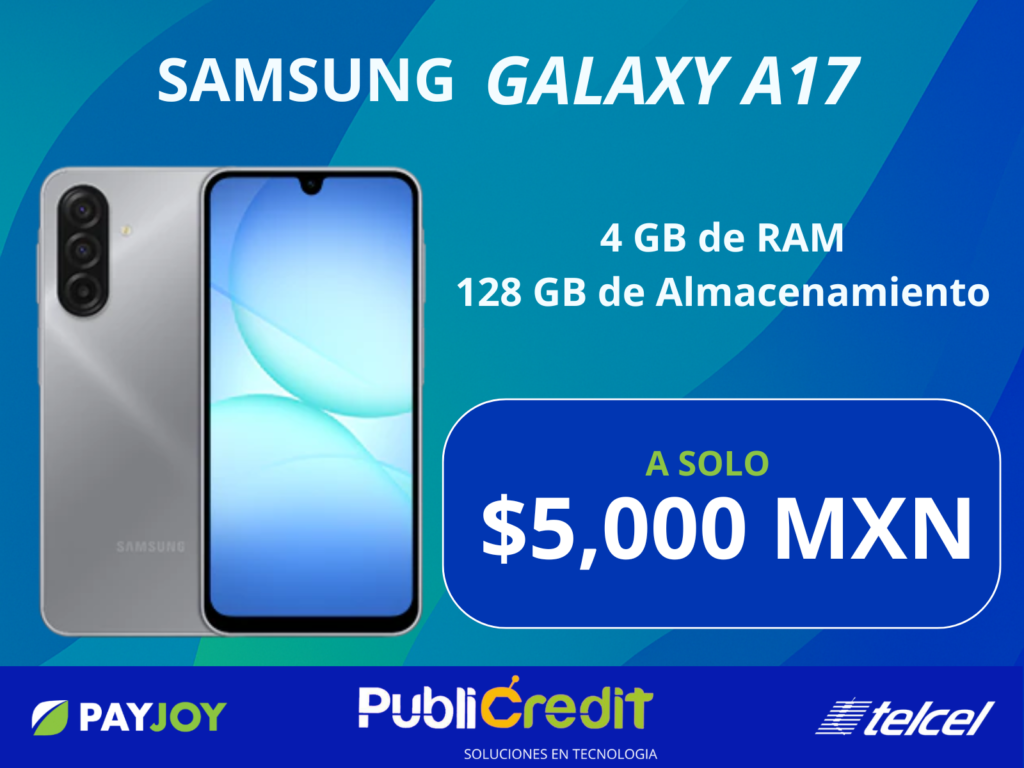 El Samsung Galaxy A17 tiene pantalla Super AMOLED de 6.7″ FHD+ a 90 Hz, ideal para ver todo más nítido y fluido, con diseño delgado e IP54 contra salpicaduras. Integra procesador Exynos 1330, 4 GB de RAM + 128 GB de almacenamiento, triple cámara de 50 MP con OIS y batería de 5,000 mAh con carga rápida de 25 W, pensada para rendir todo el día.
